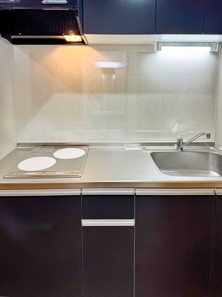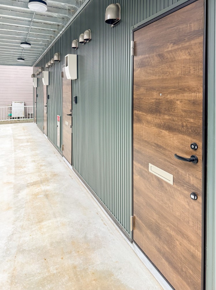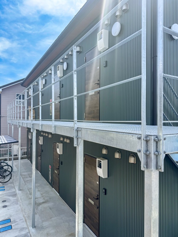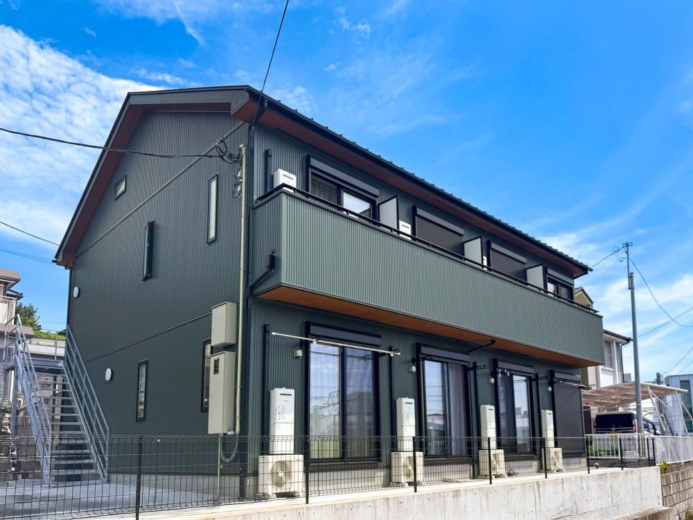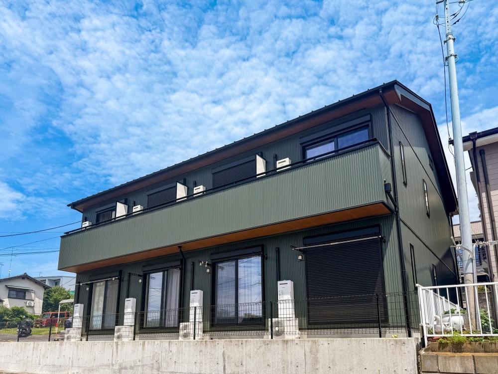 モスグリーンのガルバリウムが青空に映える外観のワンルーム集合住宅です。